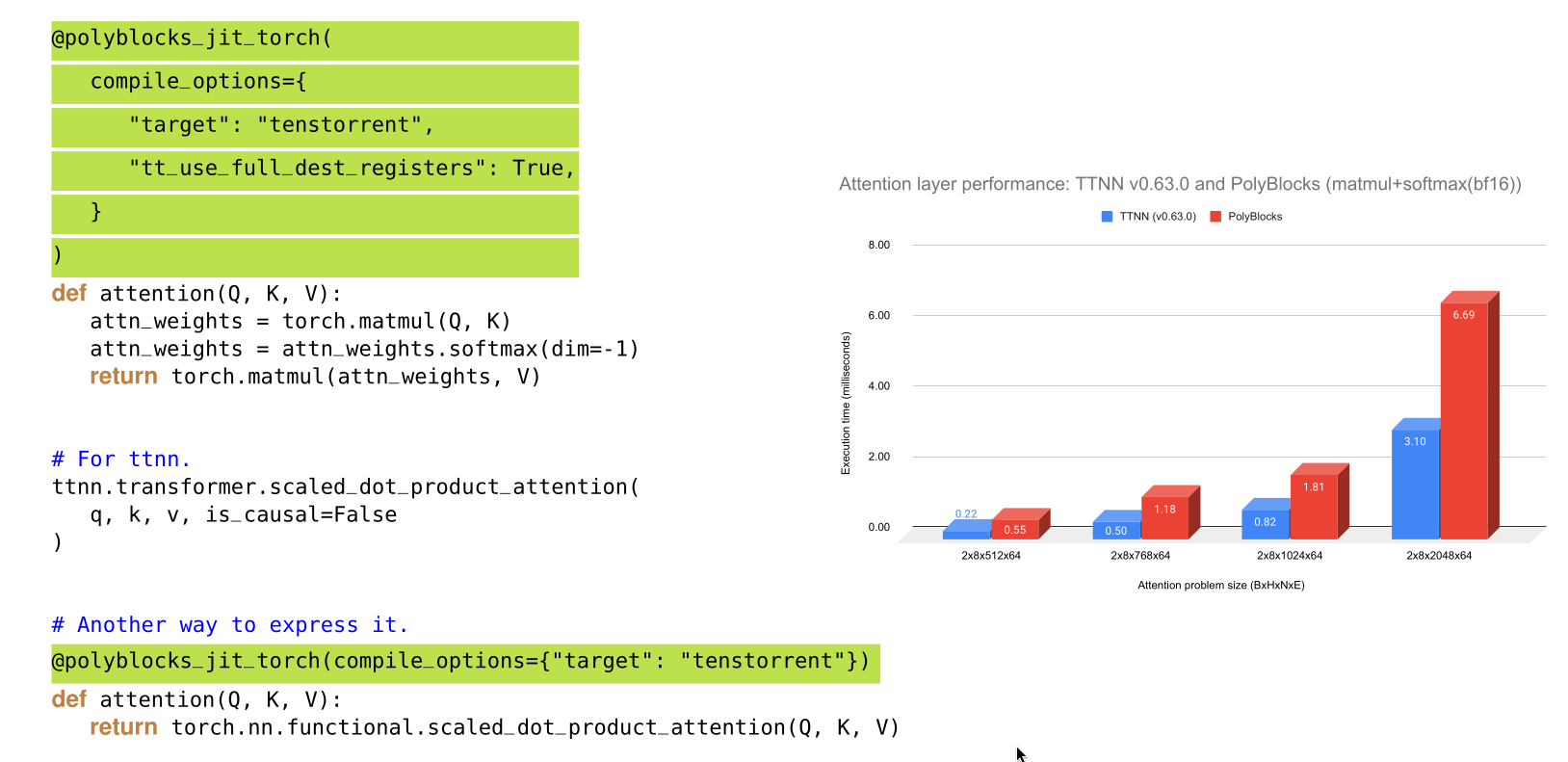 The preliminary results are highly promising – the compiler effortlessly handles complex operator compositions, including attention layers, compiling them from high-level PyTorch code with no user intervention. Expanding beyond traditional CPUs and GPUs, PolyBlocks from Polymage Labs thus now supports Tenstorrent hardware as a hardware target.